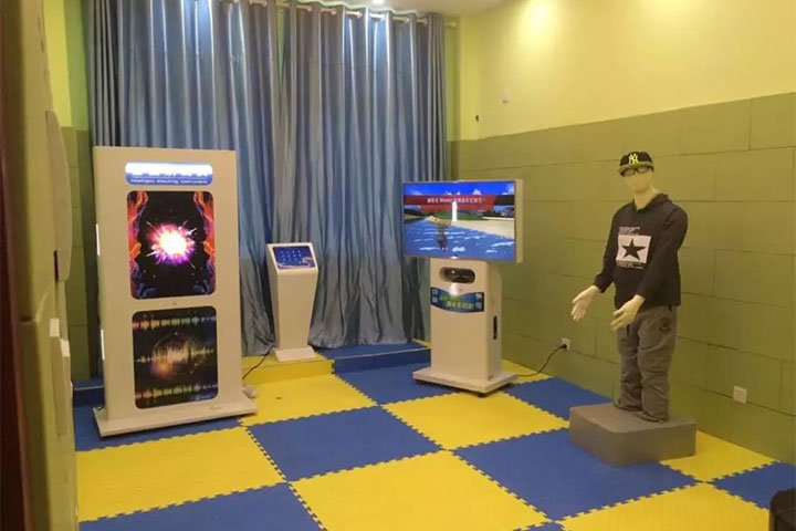 上圖是情緒宣泄室,配置的產(chǎn)品有仿真宣泄人、智能互動宣泄儀、智能吶喊三代宣泄儀,整個地面墻面都是采用我們的宣泄墻、宣泄地板。